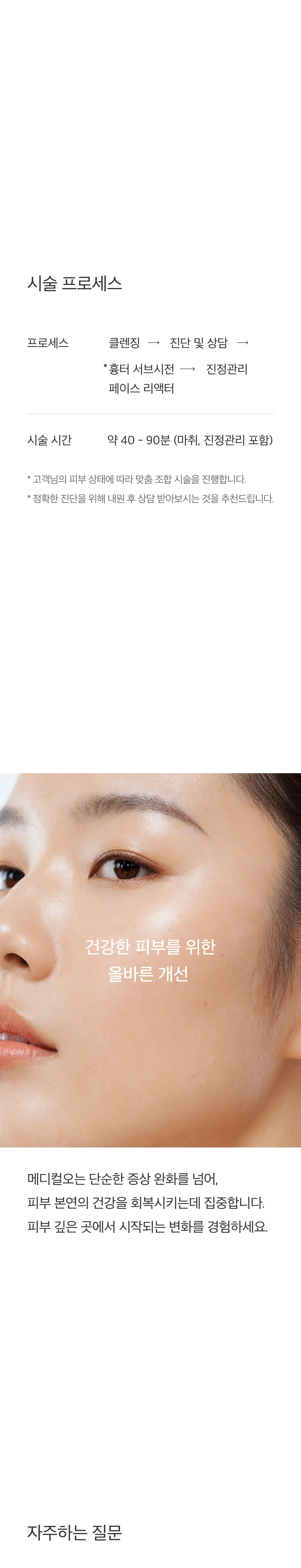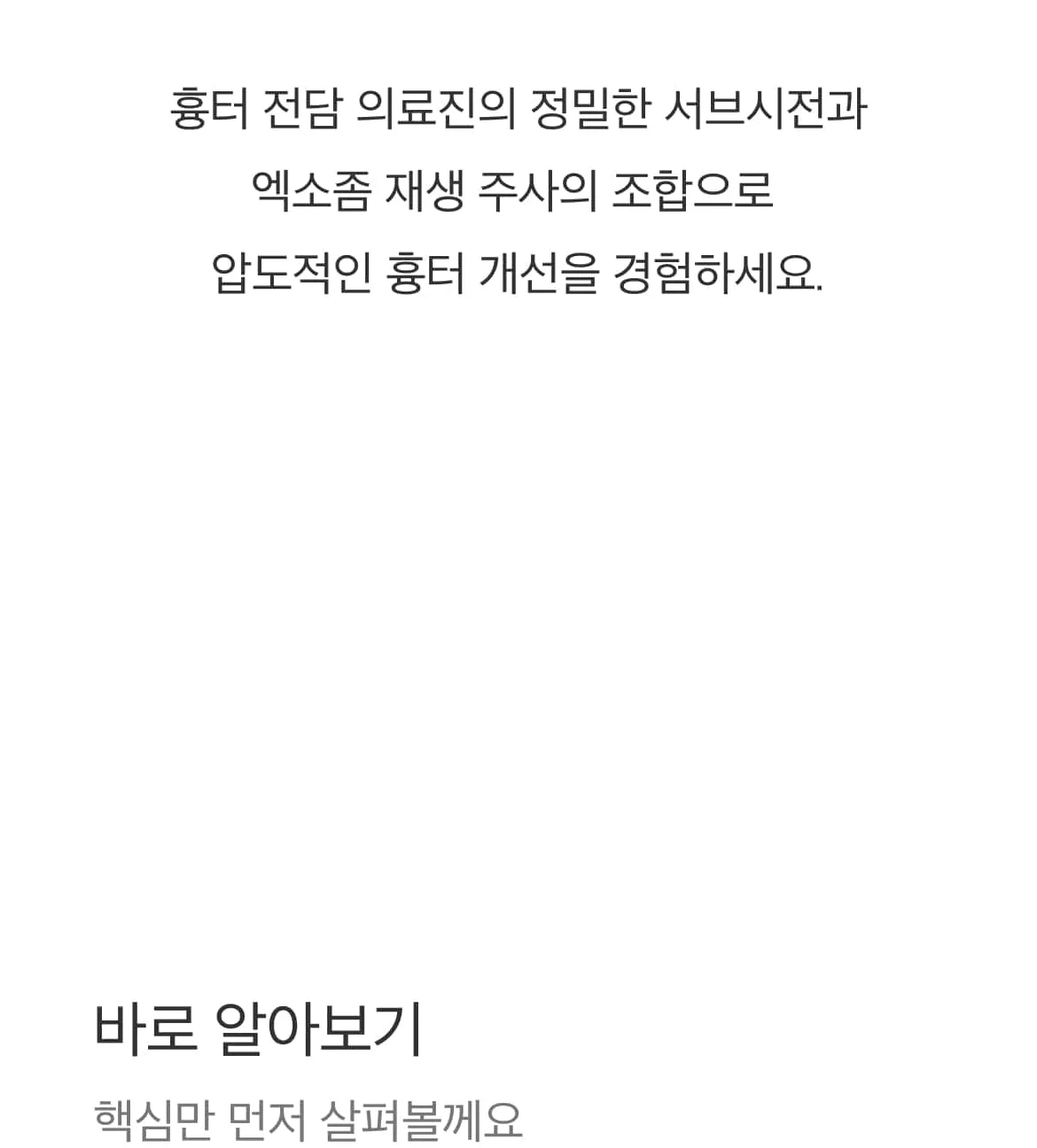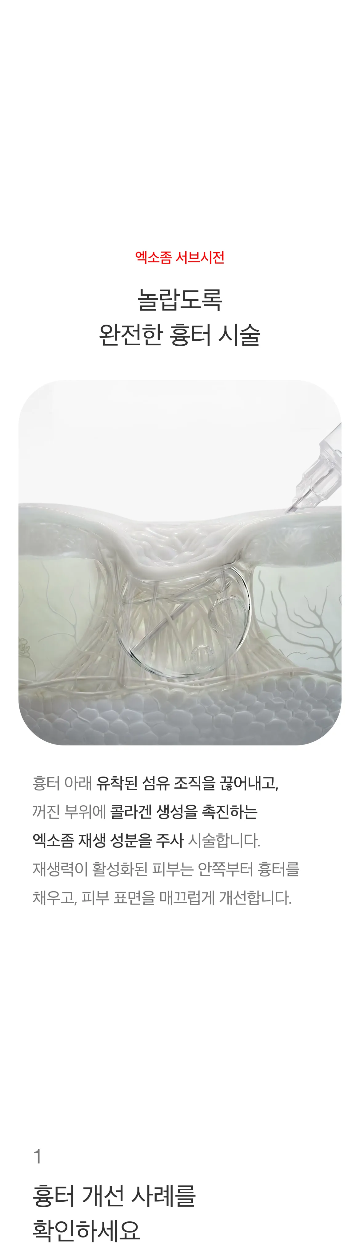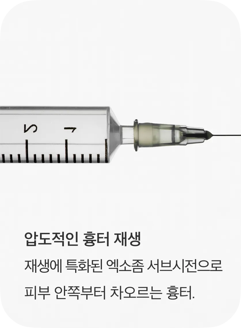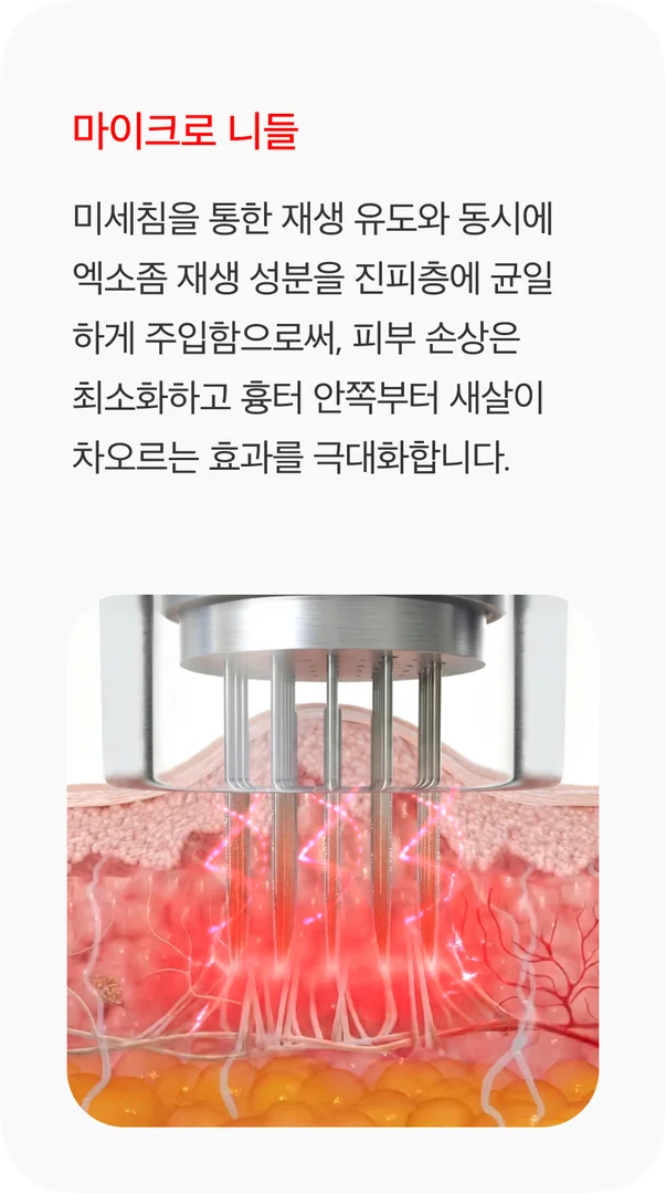 엑소좀 서브시전은 흉터 아래 엉겨 붙은 섬유 조직을 직접 끊어주는 구조적 개선 시술인 '서브시전'과, 엑소좀 재생 성분인 '페이스 리액터'를 통한 조직 재생이 동시에 이루어지는 시술입니다. 엑소좀의 강력한 조직 복원 효과는 시술 후 피부 재생 속도를 높여 흉터가 차오르는 기간을 단축시키고, 피부 표면의 톤과 결을 개선하는 데 도움을 줍니다.