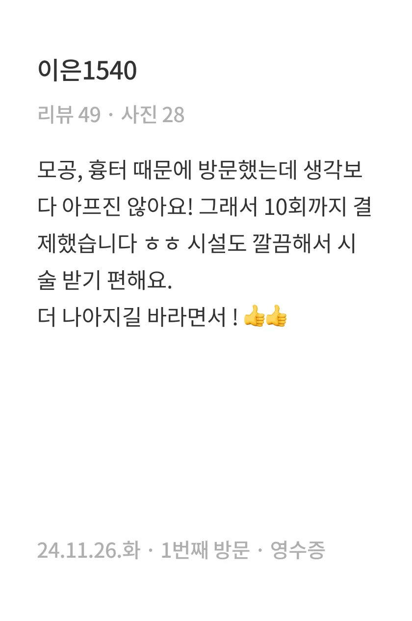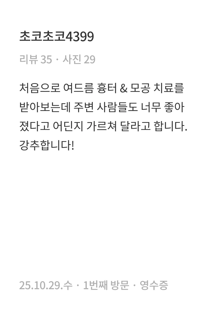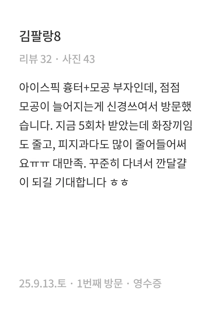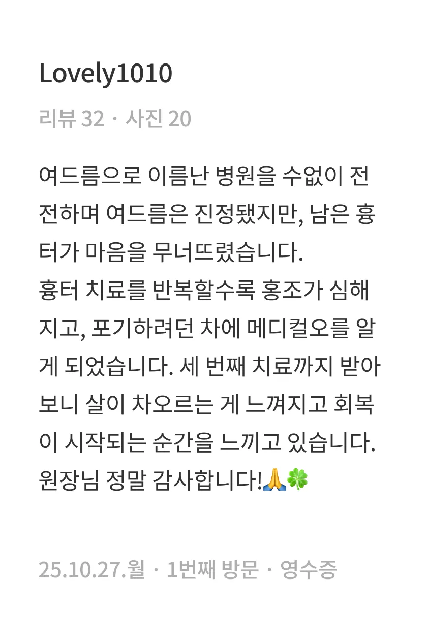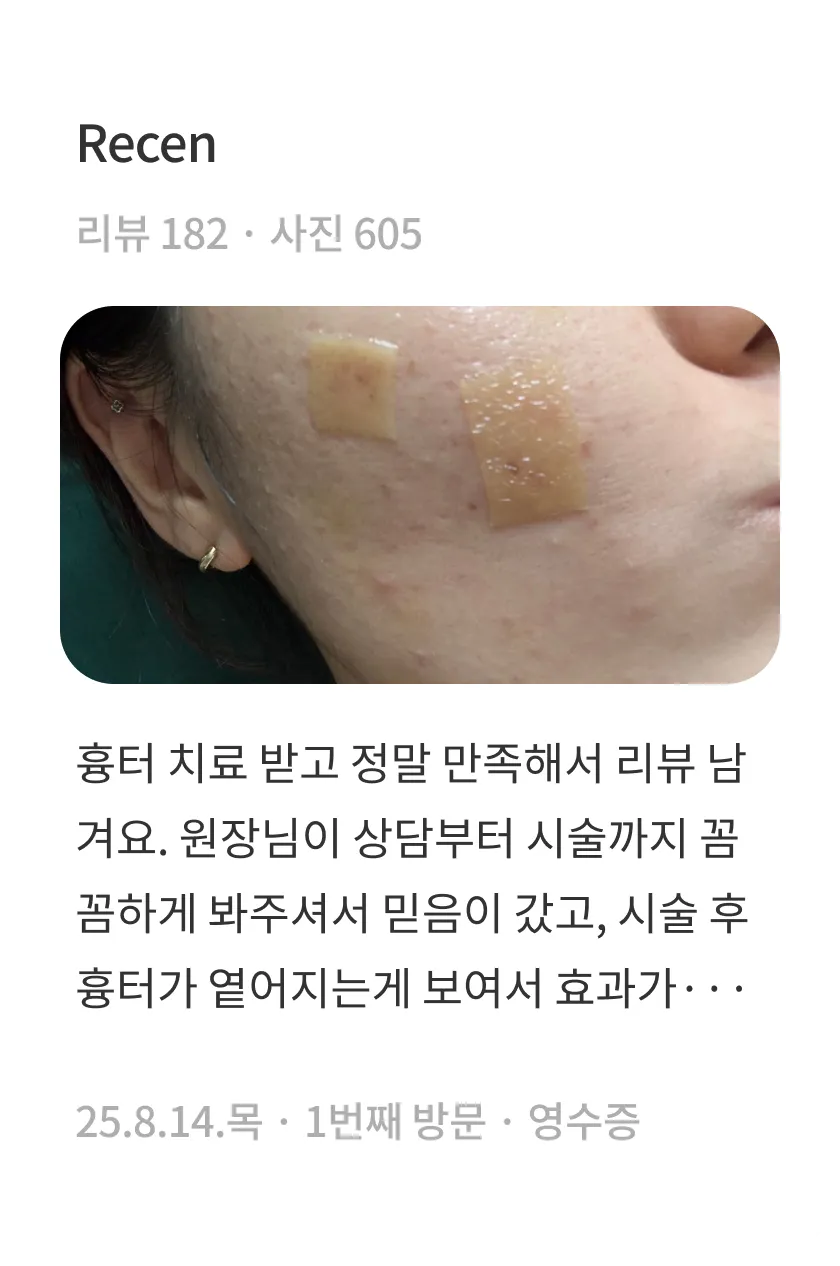 1회 시술만으로도 흉터가 부분적으로 완화되는 변화를 느끼실 수 있습니다. 다만 완전한 복원을 목표로 하는 경우, 흉터의 깊이와 넓이에 따라 필요한 시술 횟수나 간격은 달라질 수 있습니다. 특히 흉터가 깊고 넓은 경우에는 5~10회 정도의 꾸준한 시술이 권장되기도 하므로, 의료진과의 충분한 상담을 통해 흉터 유형과 피부 상태에 최적화된 치료 방향을 결정하시는 것이 좋습니다.