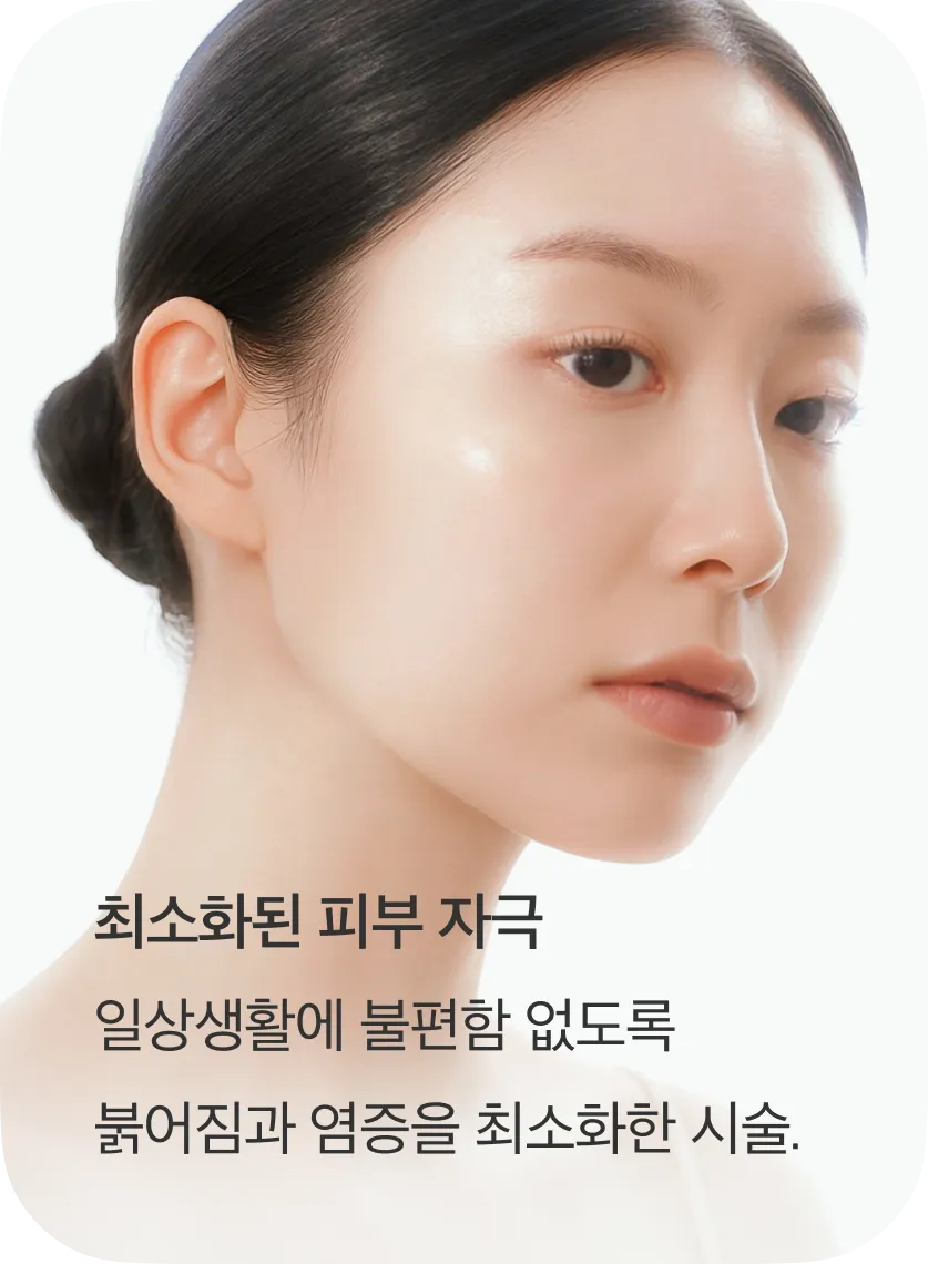 일상생활에 지장을 최소화하도록 설계된 엑소좀 서브시전 시술은 피부 표면을 손상시키지 않고, 흉터 아래 유착된 섬유 조직만을 끊어내는 방식으로 진행되어 시술 후 붉은기를 최소화합니다. 유착을 끊어내는 과정에서 일시적으로 붉은기가 나타날 수 있으나, 함께 주입되는 페이스 리액터가 염증 반응을 완화하고 과색소침착(PIH)을 사전에 억제합니다. 덕분에 서브시전 단독 시술이나 피부 표면에 자극을 주는 프락셔널 레이저에 비해 붉은기 정체 시간이 짧으며, 시술 자국에 대한 우려 없이 안정적인 복원이 가능합니다.