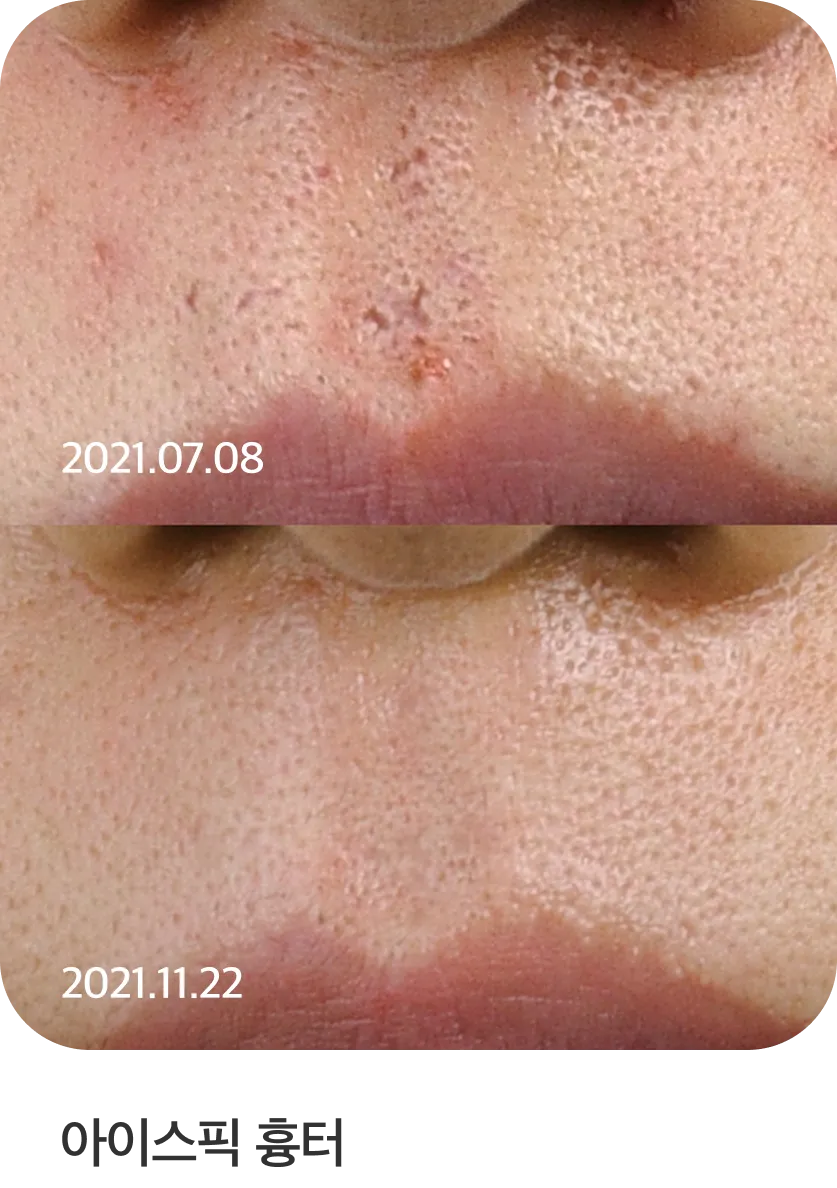 - 색소 개선. 염증과 멜라닌 억제를 유도하여 진피층의 기미를 효과적으로 개선합니다. 피부 표면에 위치한 기미의 경우 레이저 토닝을 병행하여 깨끗한 피부 톤을 완성합니다.
