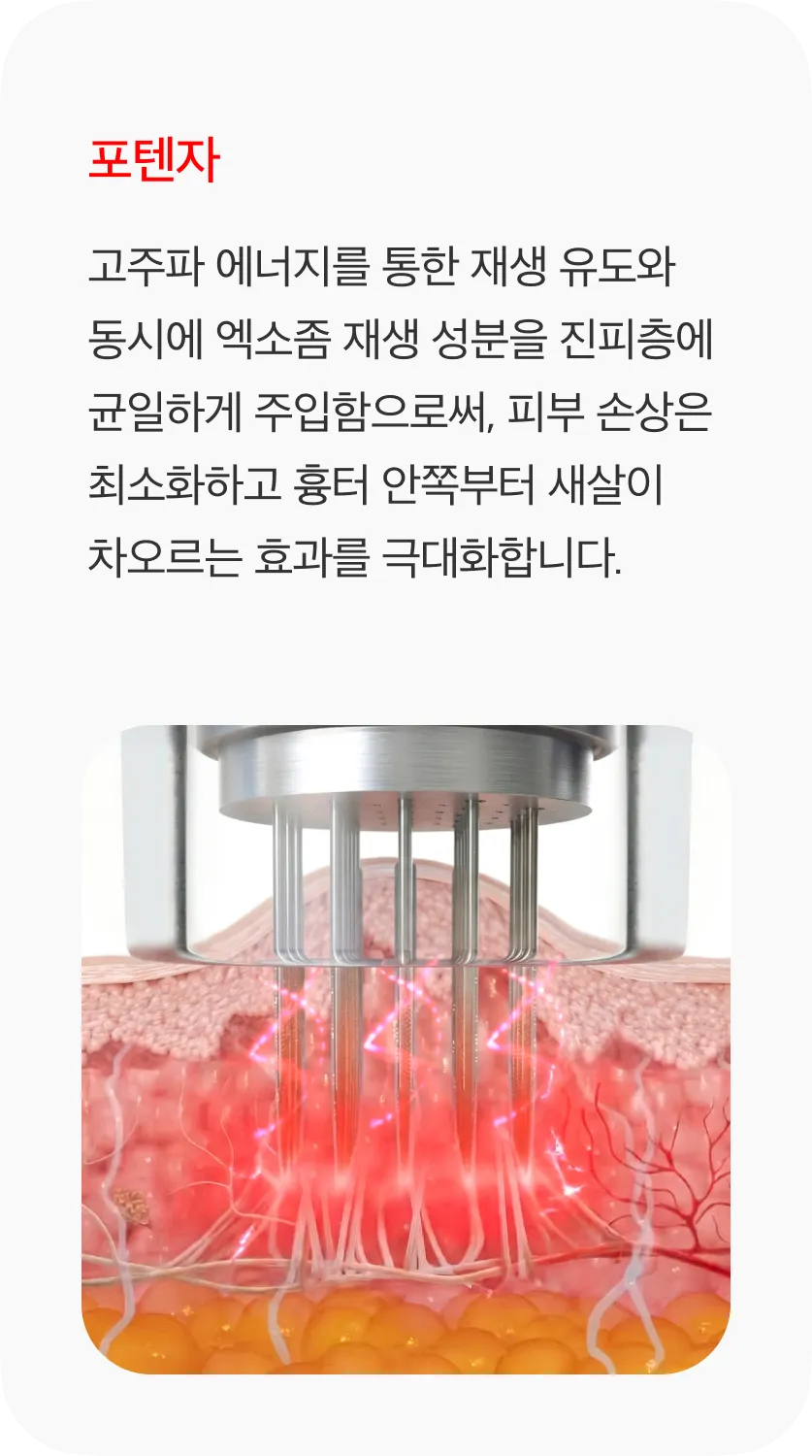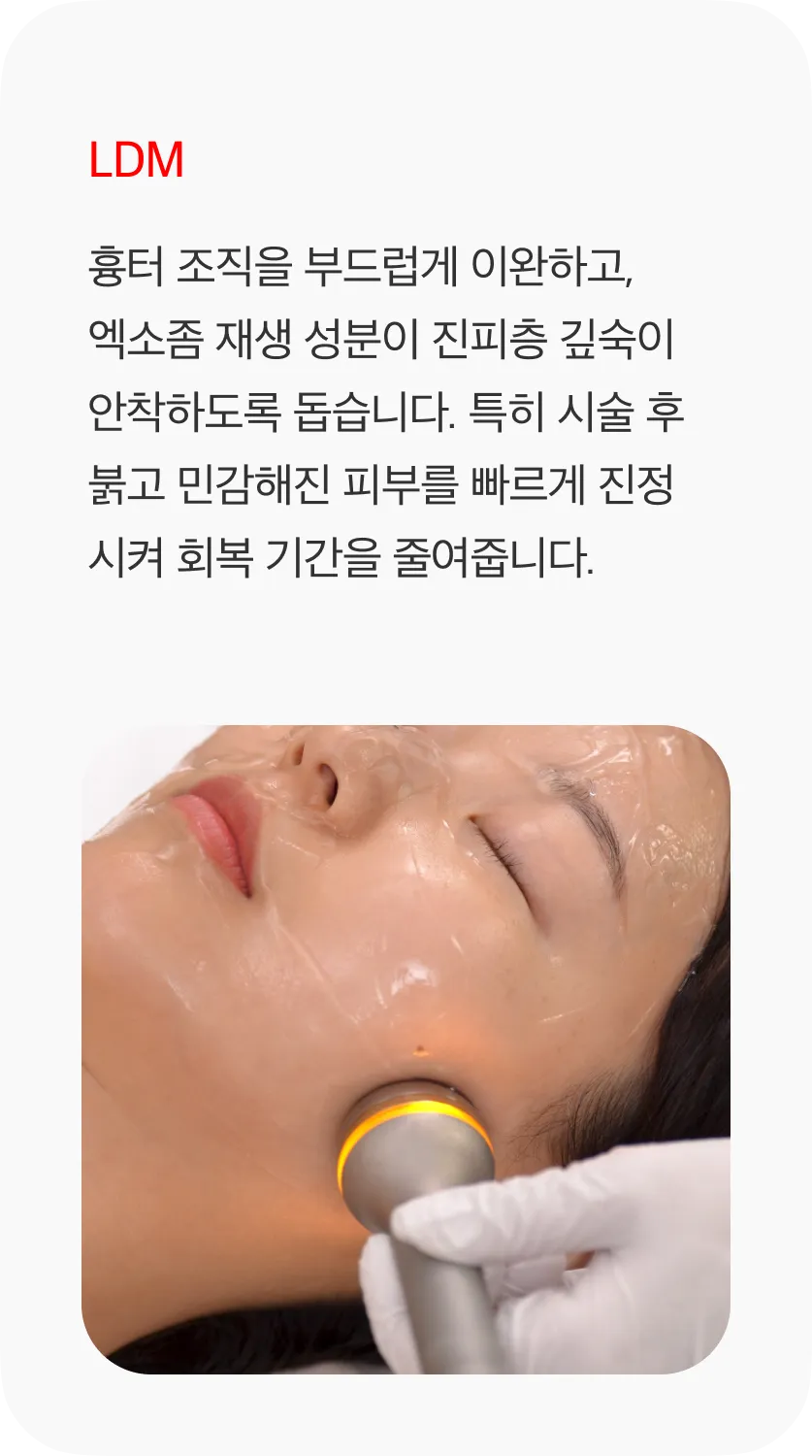 엑소좀 서브시전은 흉터 아래 엉겨 붙은 섬유 조직을 직접 끊어주는 구조적 개선 시술인 '서브시전'과, 엑소좀 재생 성분인 '페이스 리액터'를 통한 조직 재생이 동시에 이루어지는 시술입니다. 엑소좀의 강력한 조직 복원 효과는 시술 후 피부 재생 속도를 높여 흉터가 차오르는 기간을 단축시키고, 피부 표면의 톤과 결을 개선하는 데 도움을 줍니다.