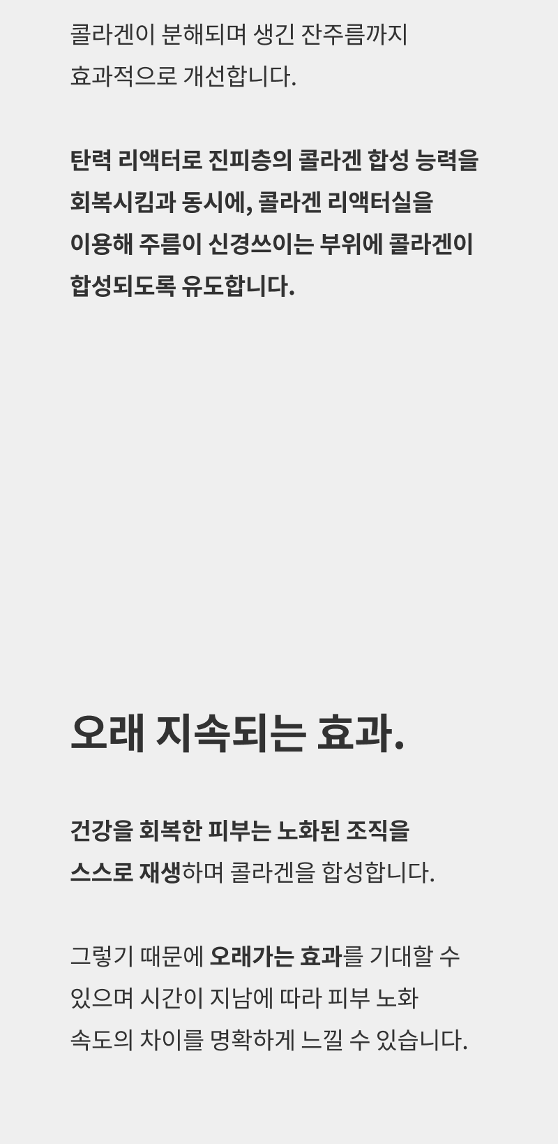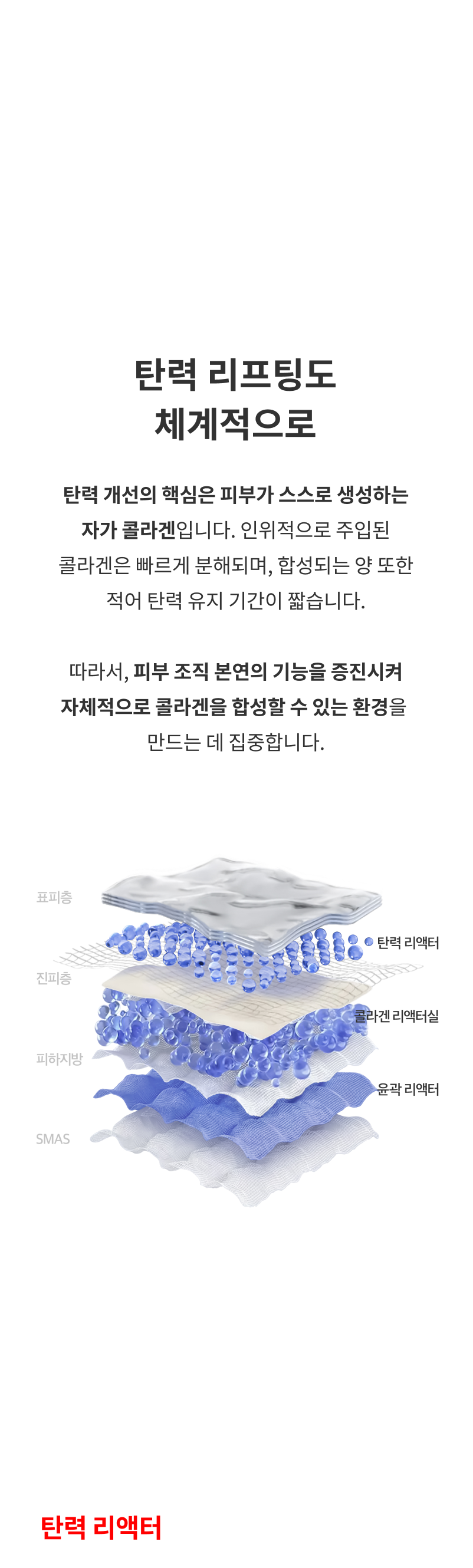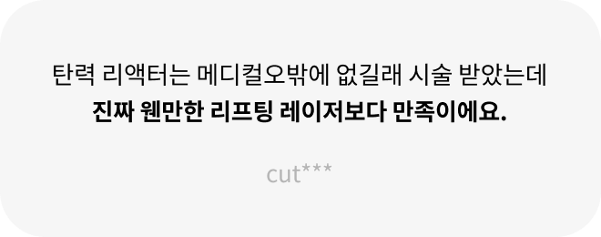 체중의 변화가 없는 한 반영구적인 효과를 기대할 수 있습니다. 또한, 인위적으로 콜라겐을 주입하는 형태가 아닌 리액터의 자가 콜라겐 재생을 유도하기 때문에 오랜 기간 효과가 유지됩니다.