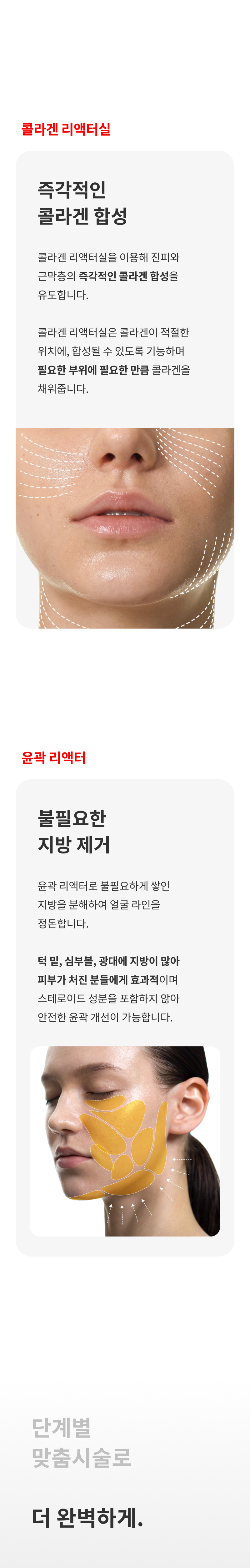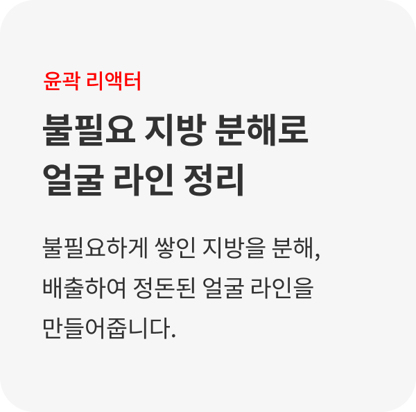 메디컬오 윤곽 리액터는 피부 손상을 일으키지 않는 재생 치료 방식으로 부작용이 없으며 화학 성분이 일체 포함되지 않아 피부 친화적으로 얼굴 라인을 디자인하는데 도움을 줍니다. 윤곽 리액터로 불필요 지방은 분해하고 탄력 리액터로 콜라겐을 재생하여 건강하고 아름다운 V라인을 완성해보세요.